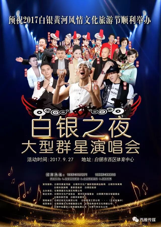 加强宣传推广,打造旅游品牌,以节会的形式吸引更多的人走进白银、感受白银、畅游白银,提升白银文化旅游影响力, 促动创建全国文明城市,创建全国公共文化示范区活动深入开展,按照市委、市政府关于举办黄河风情文化旅游节的统一部署,由白银市委宣传部、白银市文化广播影视新闻出版局、白银市体育局、白银市旅游局、景泰县政府、白银区政府策划指导,白银市文化产业协会、黄河石林管委会、白银黄河假日城管委会、白银市群艺馆、白银市体育中心联合支持,甘肃莱茵文化演艺公司主办,白银正柱文化商贸公司、白银泰龙工贸公司等捐资赞助,作为白银黄河风情文化旅游节十大活动之一的“白银之夜”大型明星演唱会,将于9月27日晚在白银西区广场盛大开启。