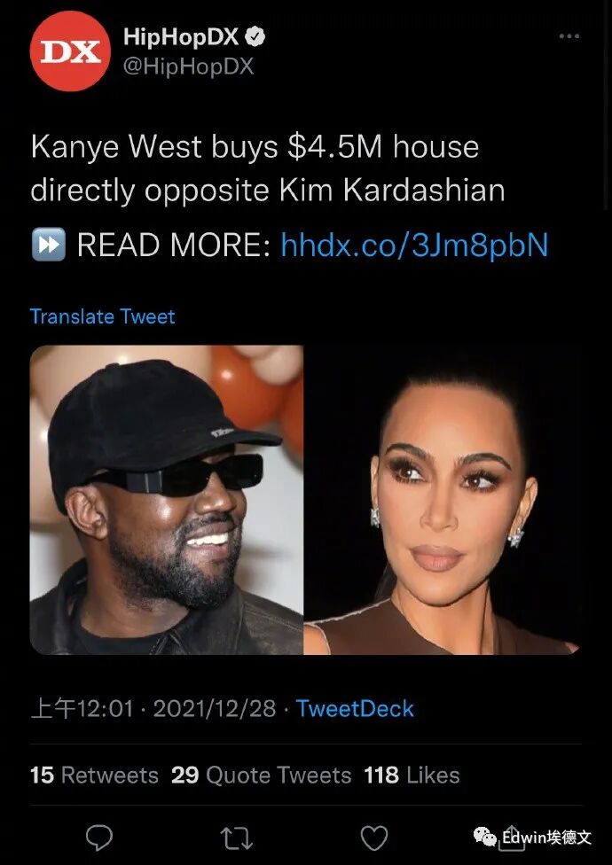 虽然侃爷Kanye West花450万美元在卡戴珊Kim Kardashian家对面买了一套房子。