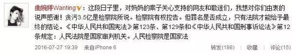 母亲出事后,由于不允许探视,曲婉婷也只能每夜以泪洗面,以歌声诉说心里的苦。在微博上也是发布思念母亲的内容,坚信妈妈是清白的、无罪的。