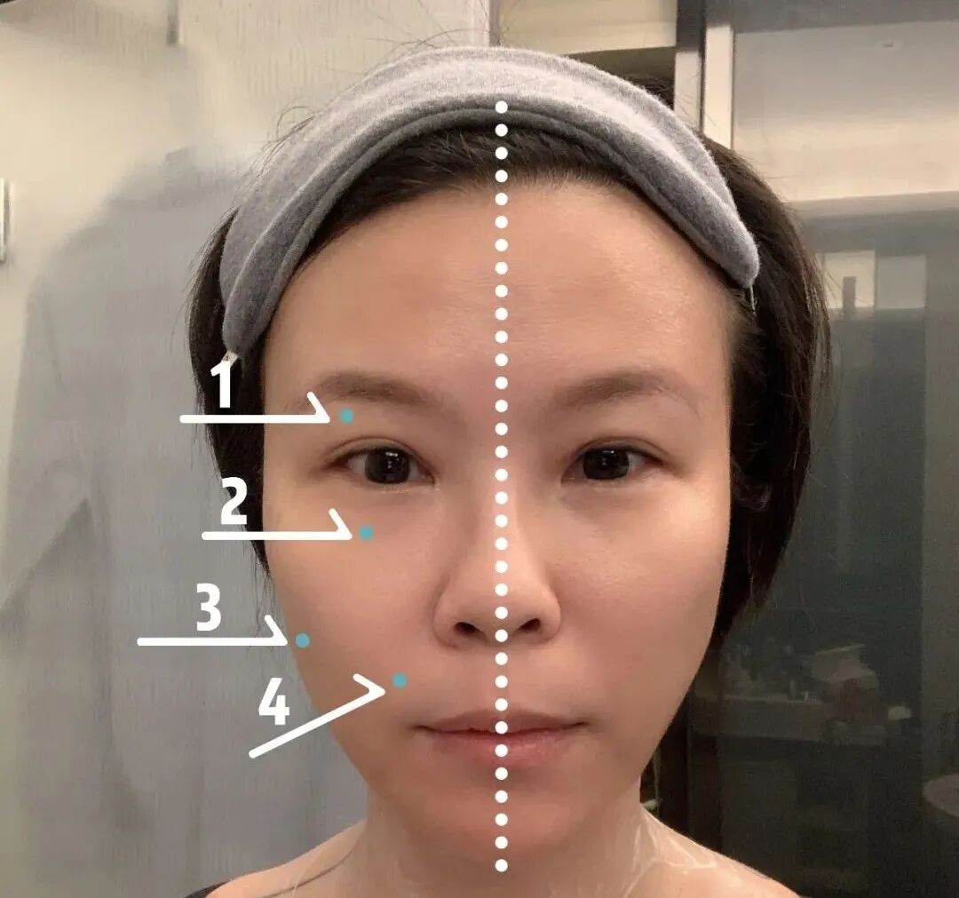 箭头 4 位置:法令纹下沿,比右侧没用面膜部分,明显淡化。