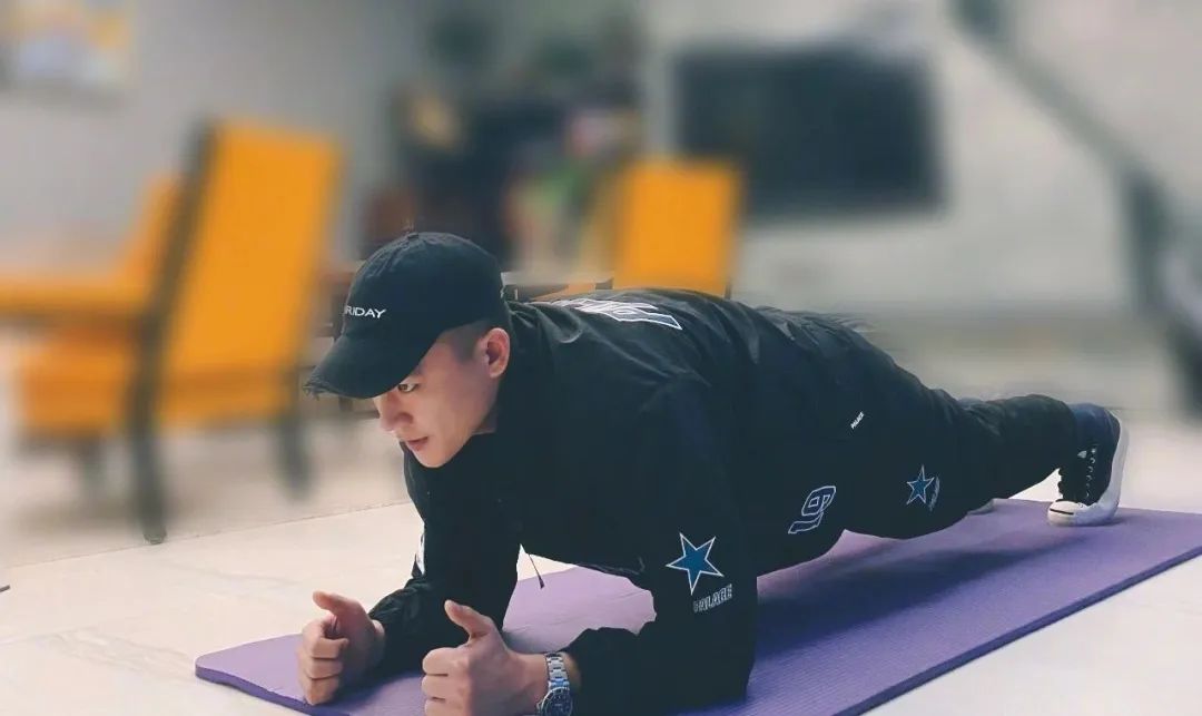 这不,昨晚他就晒了张做平板支撑的照片