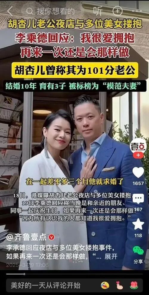 李乘德倒是很快就回应了,在社交媒体上发了一张卡通图,上面写着”A Hug a Day Keeps the Doctor Away”,还配文说自己只是一个”热爱拥抱的人”。