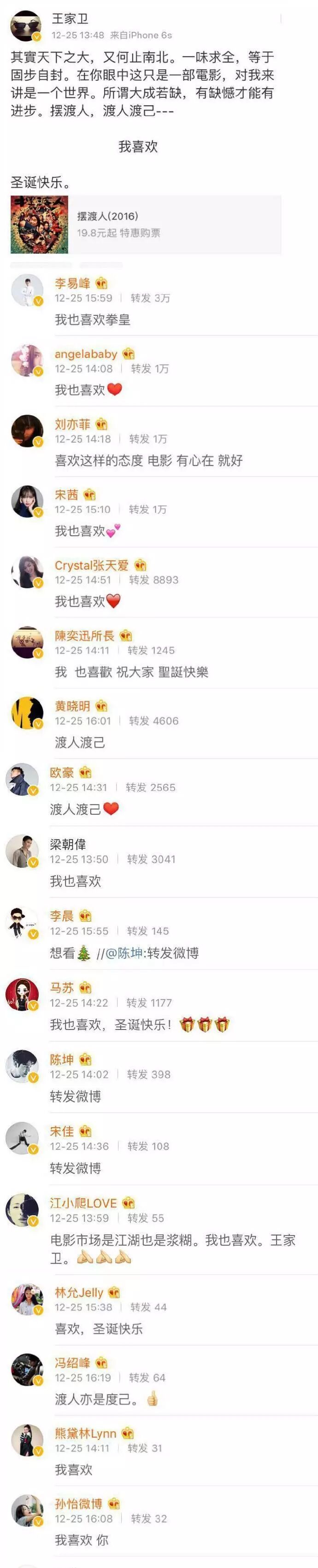 对于豆瓣评分4.0分的《摆渡人》,王家卫碍于面子问题发了一条微博,几十位当红明星纷纷在底下评论和转发说“我喜欢”,这是业务能力,阿谀奉承还是要有的。
