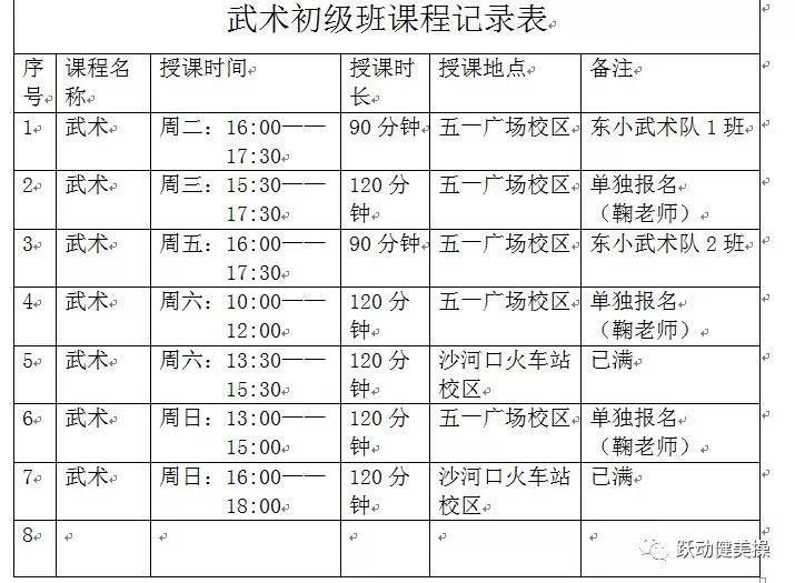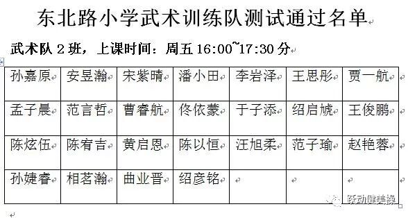 1.测试通过的同学,已经分成两个班,分别在周二和周五分开上免费公益课程,建议一周至少上两次武术训练课程,以确保训练效果,需要具体报哪个时段的课程,与鞠老师联络。