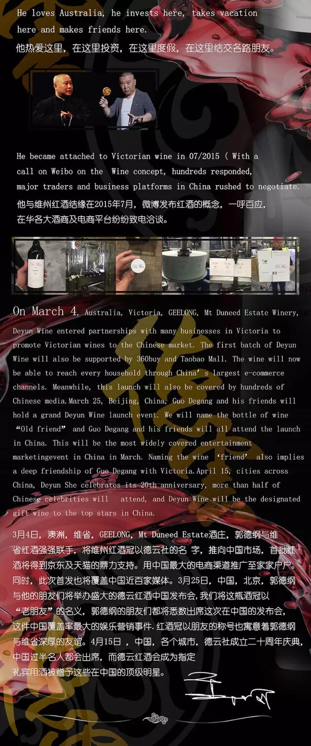 本次德云红酒的澳洲首发仪式将在3月4日墨尔本唐人街祥会所举行,澳洲各界名流,上议院及下议院议长都将亲临现场,国内大咖阿里巴巴也将首次在澳洲为产品站台,合力推广维省红酒的中国份额。