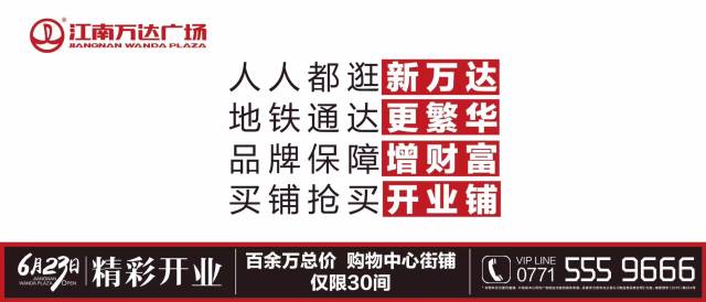 江南万达广场的崛起意味着南宁江南区将迎来城市中心新繁华,开启市民生活新方式,创造商业地产新巅峰!用繁华兑现承诺,真正成为城市信心与生活之源。6月23日,江南万达广场将盛大精彩开业,迎来江南商业新时代,光耀南宁,璀璨江南。