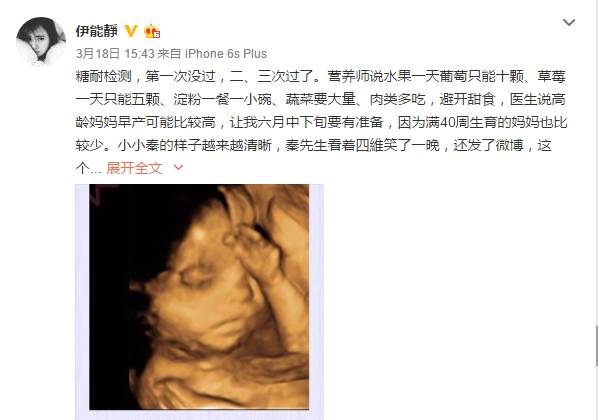 伊能静经常会晒很多关于她怀孕的状态以及分享一下高龄孕妇的心得。3月18日下午,伊能静晒出二胎宝宝的四维图,宝宝轮廓清晰可见。她透露,高龄妈妈早产可能性比较高,医生让六月中下旬做准备。