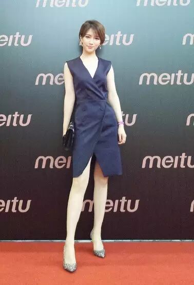 美图手机发布会,精致的妆容配上干净利落的黑色开衩裙,性感美艳,风情十足~