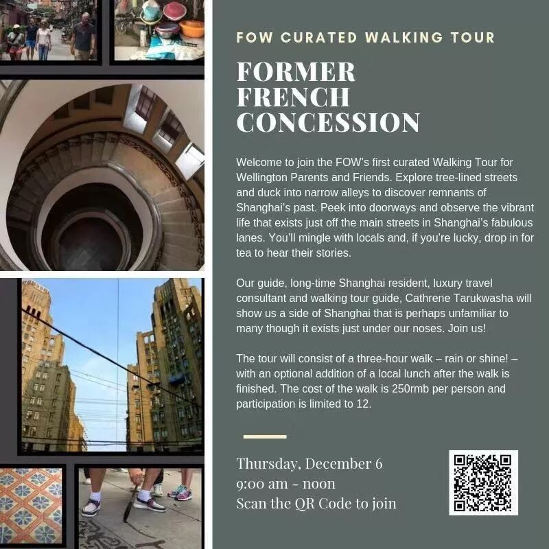 We welcome you to join FOW’s first curated walking tour for Wellington parents and friends. We hope to offer you a different perspective of Shanghai once a month. Unfortunately, space is limited so please sign up early. Tours take place on the date and time specified, rain or shine! So please come prepared to enjoy a part of Shanghai you may not see every day. Our first tour is a classic walking tour of the Former French Concession.
