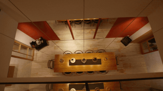 从楼上往下看,一楼餐厅的灯是垂直悬挂下吊的,简洁不失设计感。
