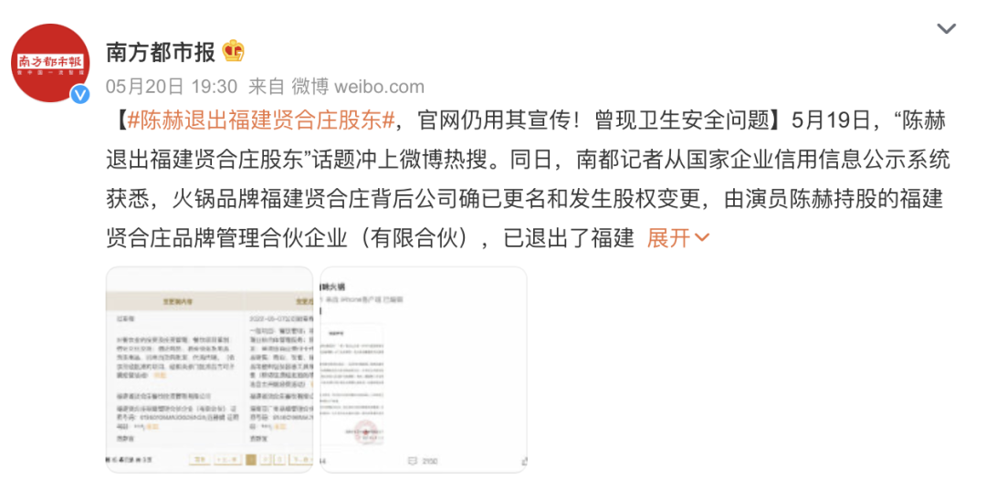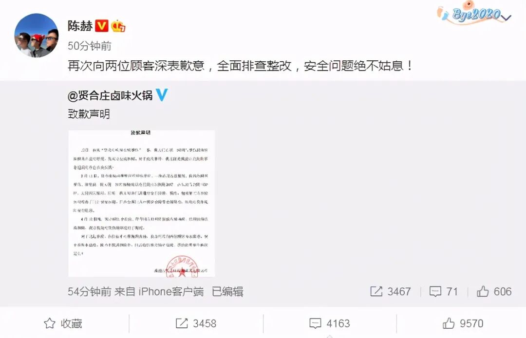 今年4月贤合庄某店出现安全问题,陈赫还在个人微博以店铺管理者名义道歉。