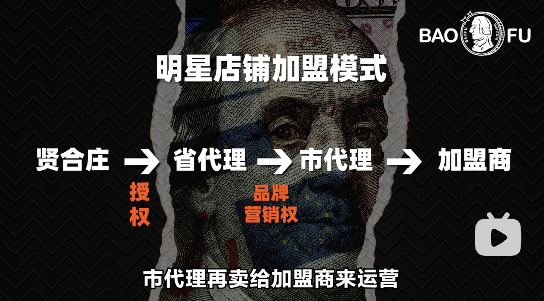 据@暴富研究所 报道,贤合庄的“加盟模式”,有省代理、市代理、加盟商4个等级。