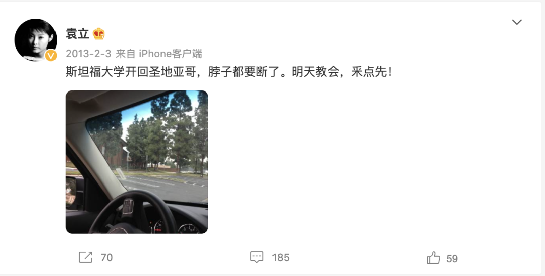袁立有一段时间治病租住在斯坦福大学旁边,租金特别贵,而且房型老,还在地震带上。
