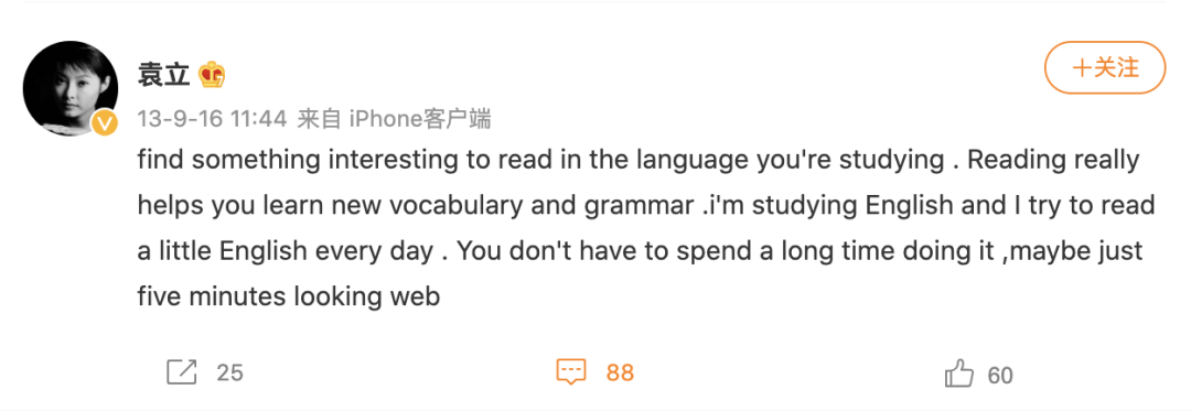 早期,袁立其实英语不太好,她有时候发的带英语的微博,老有单词错误、语法错误,有网友还嫌她英语字写得丑。