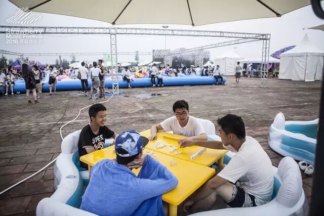 成都人民有多爱麻将?从会所包间、农家小院、路边茶馆到公园,甚至只是露天路边小广场,管它晴天下雨,支个遮阳伞就能打一天麻将!桌上不分大人小孩、男女老少,可以说,打麻将已经成为一种生活方式。成都草莓音乐节现场设置8个麻将桌,欢迎你组局来耍!