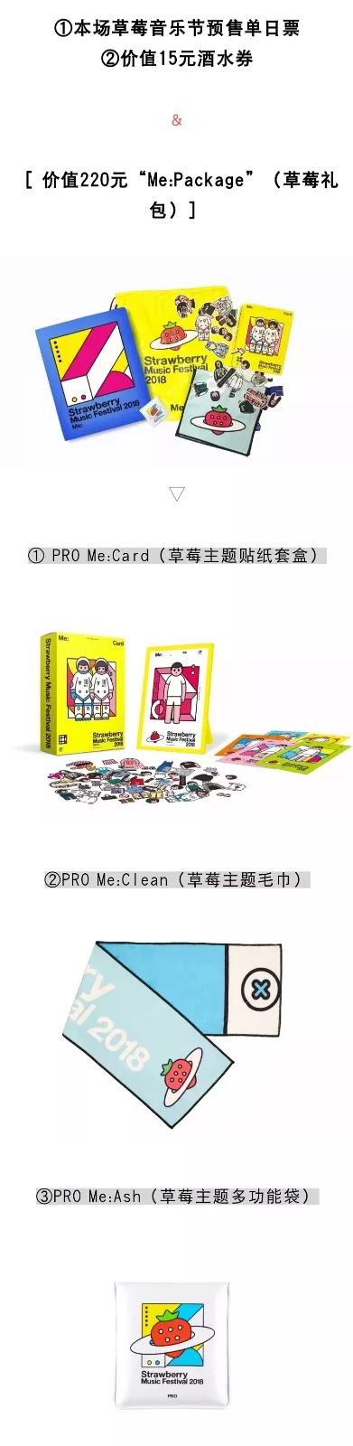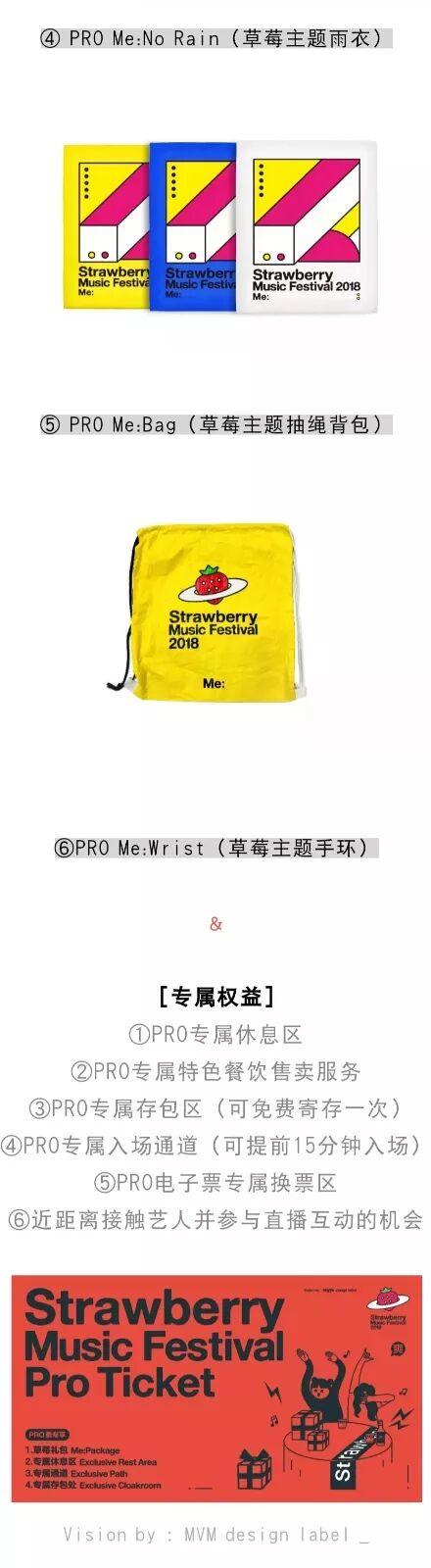 购买PRO门票的观众朋友可在兑票处领取专属礼包,并享受专属进场通道、凭手环进入位于草莓舞台对面的专属休息区后,凭专属酒卡还可领取免费酒水一杯!更可享受特色餐饮及手机充电服务,还有面部彩绘等趣味活动,更多新奇体验等你解锁!