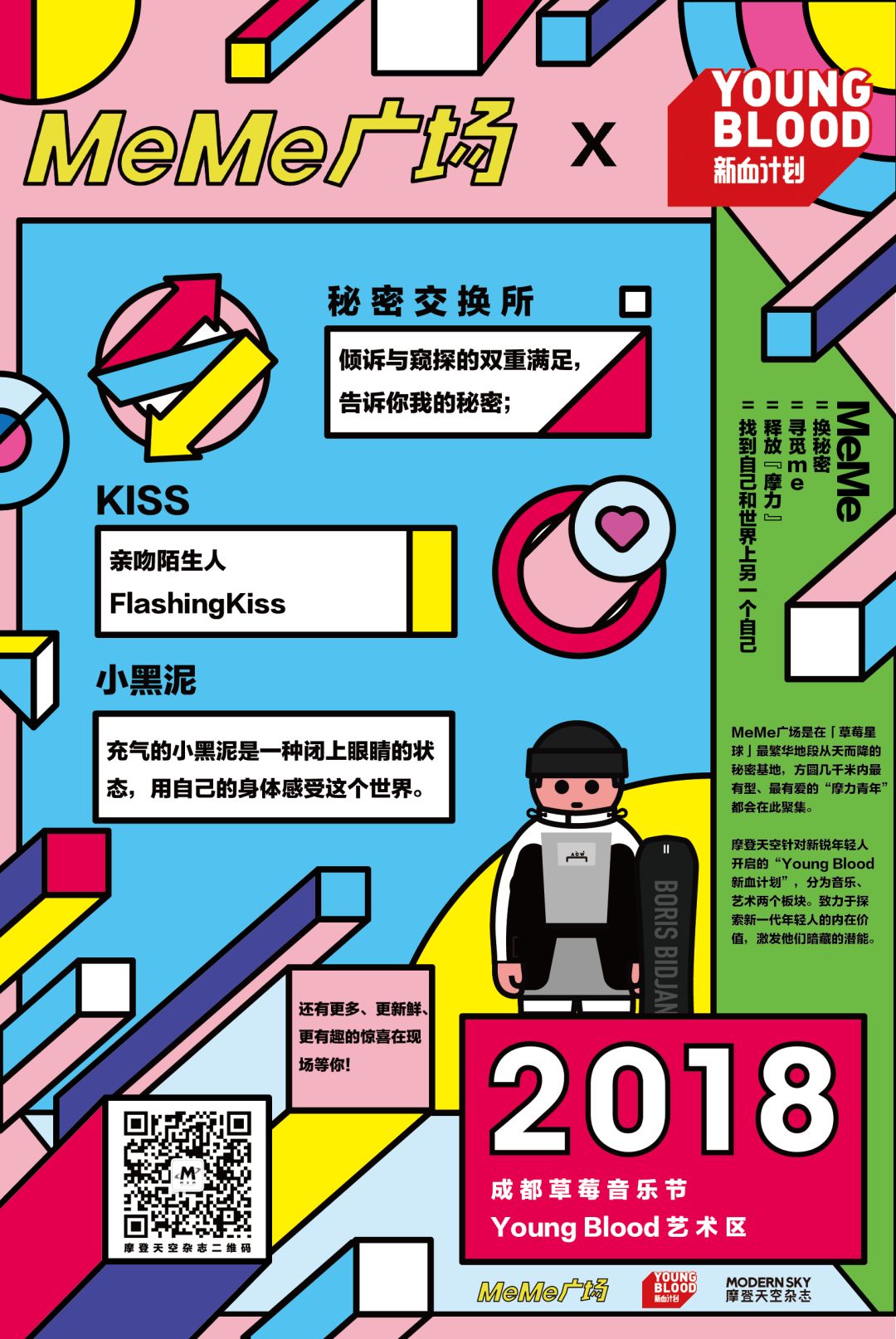 成都草莓音乐节,将会有一颗神秘的闪亮星球,降落在Young Blood艺术区。它的名字叫做——Young Blood艺术区✖️MeMe广场。在舞台下还没High够?你可以接着来Young Blood艺术区✖️MeMe广场挥洒你的荷尔蒙、邂逅你中意的男孩、女孩;闭上眼睛用舌尖感受陌生人的温度;创造你和TA的“危险罗曼蒂克”,更可以来跟着小黑泥一起,放大自己去更多的感受这个世界。