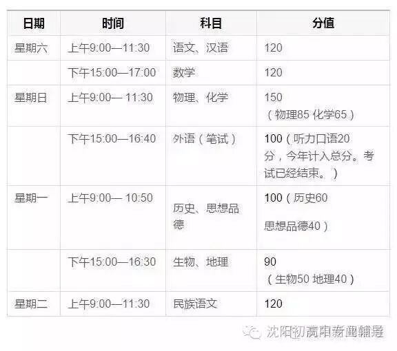 由于下午科目考试的开考时间调整为15:00,为避免第一天下午考试结束时间过晚,沈阳市将考试时长120分钟的数学科目安排在第一天下午,将考试时长150分钟的物理、化学科目安排在第二天上午。