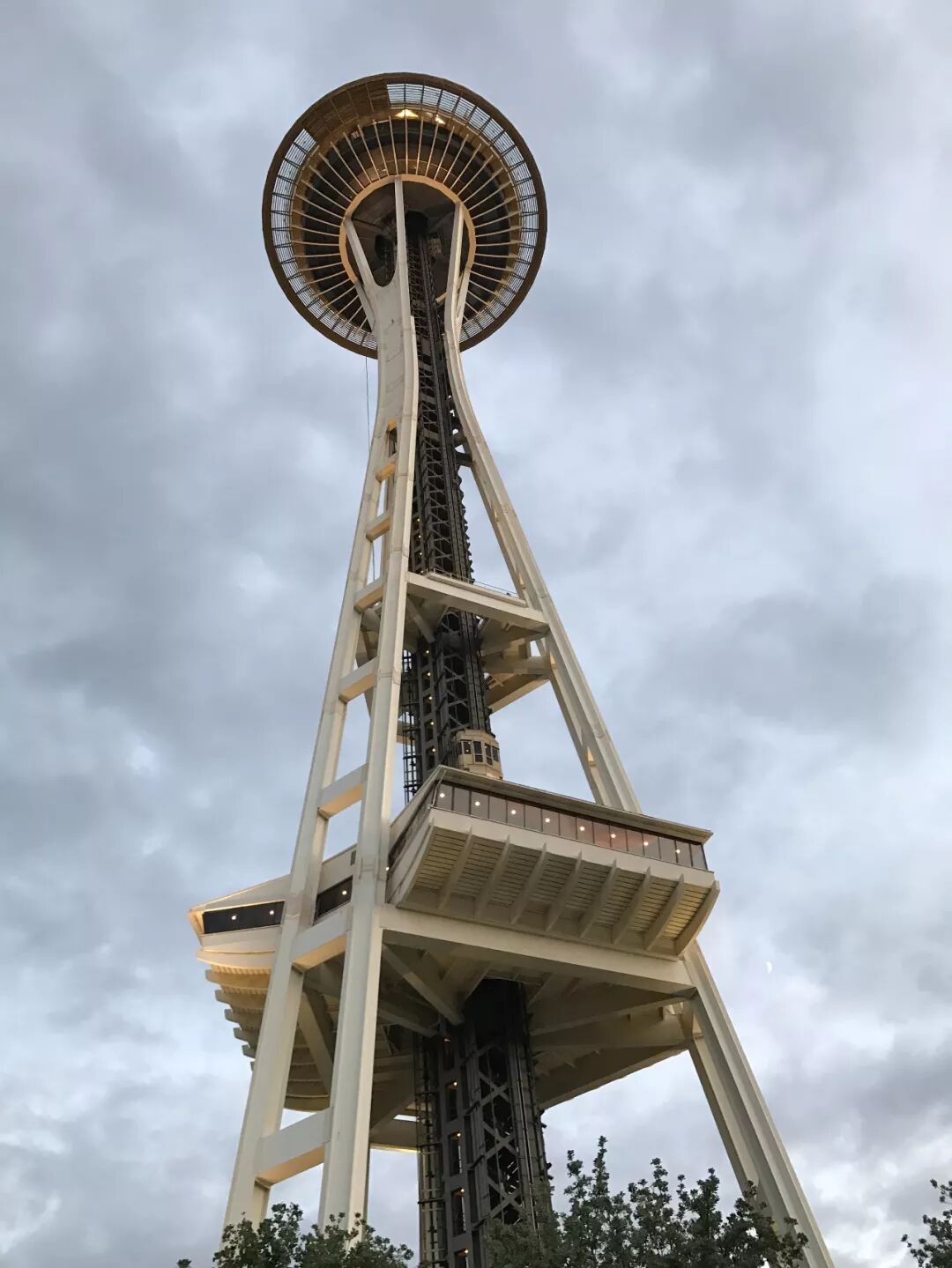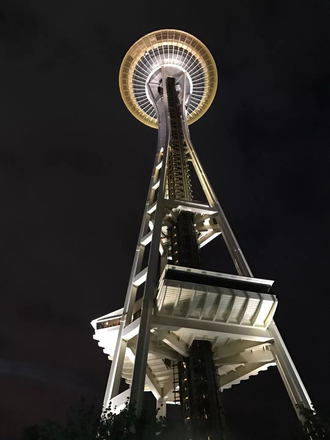 从塔底平台购票后乘坐电梯直达观景平台,整个四周都是扎实的玻璃围成的观景玻璃墙,只要你胆子大,尽可以踩在长凳上躺在斜玻璃上拍照。等到回到地面的时候,已经夜色笼罩,亮灯的太空针塔在黑夜里像极了头戴王冠的窈窕公主。