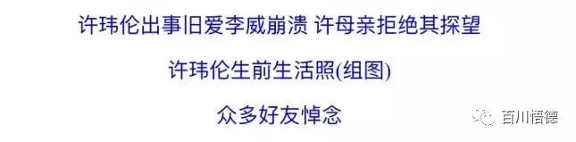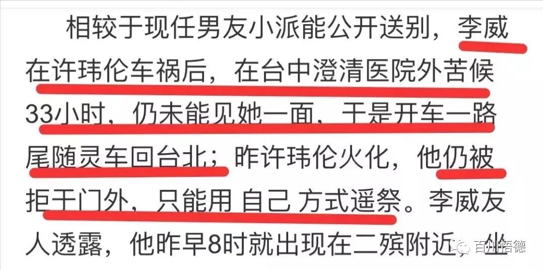 据说,李威赶到后不被允许进病房,只能默默在自己车上苦守33个小时,后来许家也不让他参加许玮伦的告别仪式和葬礼,他只能开车跟随,遥遥祭奠。