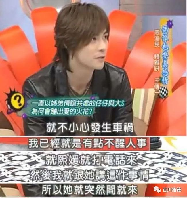 2005年,周渝民发生车祸,狗仔们在现场没等到正牌女友许玮伦现身,却意外拍到了神情紧张的大S。