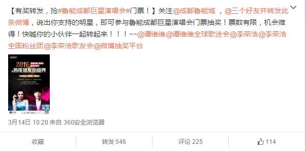 关注成都鲁能城官方微博账号,转发置顶微博,说出你支持的明信并@三位好友,即有机会抽取演唱会门票。
