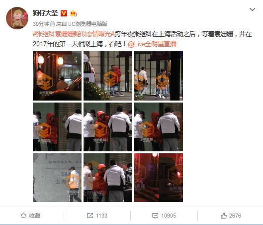 20117年,张继科在东方跨年,袁姗姗在上海拍戏,之后两人同车到酒店,有几位好友在场,第二天早上被拍到出大门。