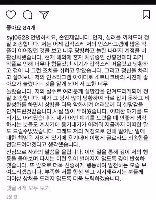 在这封道歉信中,孙妍再表示她也是后来才注意到自己给斯托尼科娃点赞了,当时自己也吓了一跳。因为她自己的失误向大家道歉。她看到众多恶评一时乱了阵脚才关闭了账号,没想到却让事件更加恶化。为了防止这样的事再发生,她将深刻反省。