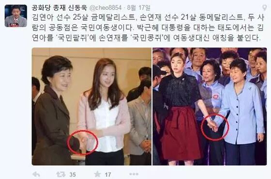 早在2015年,韩国前总统朴槿惠的妹夫就曾在个人社交媒体上发布了孙妍在和金妍儿与朴槿惠握手的对比图,称赞孙妍在善良并表示了对金妍儿“耍大牌”的不满。