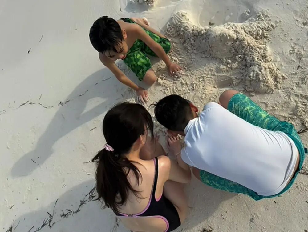 陪着双胞胎儿子玩完水 陈若仪又带他们去沙滩玩沙子、抓寄居蟹。她蹲在地上和孩子们一起挖沙坑 耐心地教他们辨认寄居蟹的壳 时不时帮孩子擦去脸上的沙子。有个孩子举着小铲子问 “妈妈你看这只蟹是不是在搬家” 陈若仪笑着点头 眼里的温柔藏都藏不住。网友们看了都感慨 有这样漂亮又有耐心的妈妈 kimi 兄弟三人真的太幸福了。