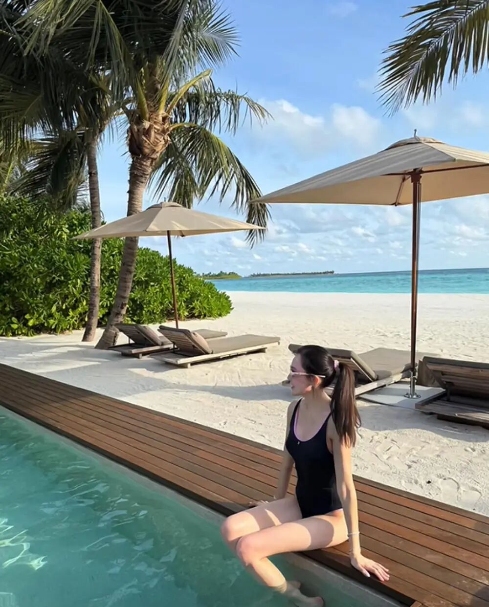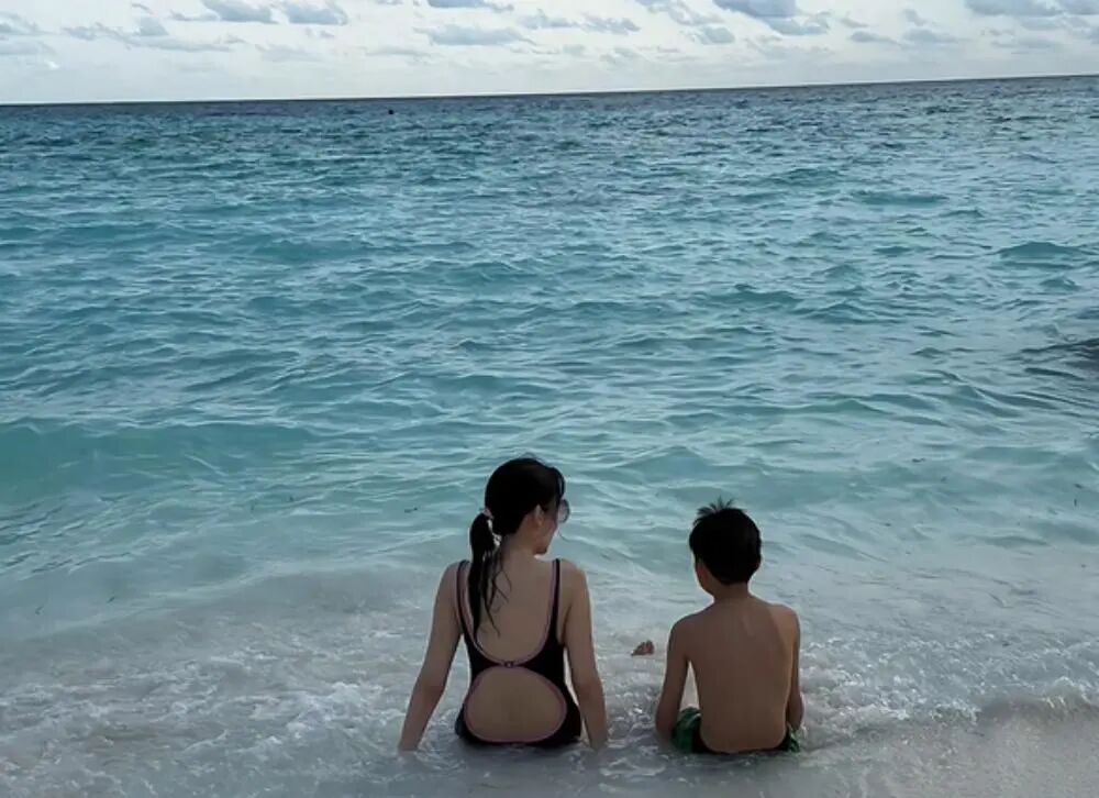 在酒店短暂休息后 陈若仪就换上泳装带着双胞胎儿子去泳池玩水。她牵着一个孩子的手 另一个孩子在旁边蹦蹦跳跳 三人面向大海站成一排 阳光把他们的影子拉得长长的 画面温馨得让人忍不住微笑。玩的时候弟弟 kyson 总爱往妈妈怀里钻 陈若仪耐心地教他划水 哥哥 jenson 则在一旁当 “小老师” 说 “要像爸爸教的那样伸直胳膊”。