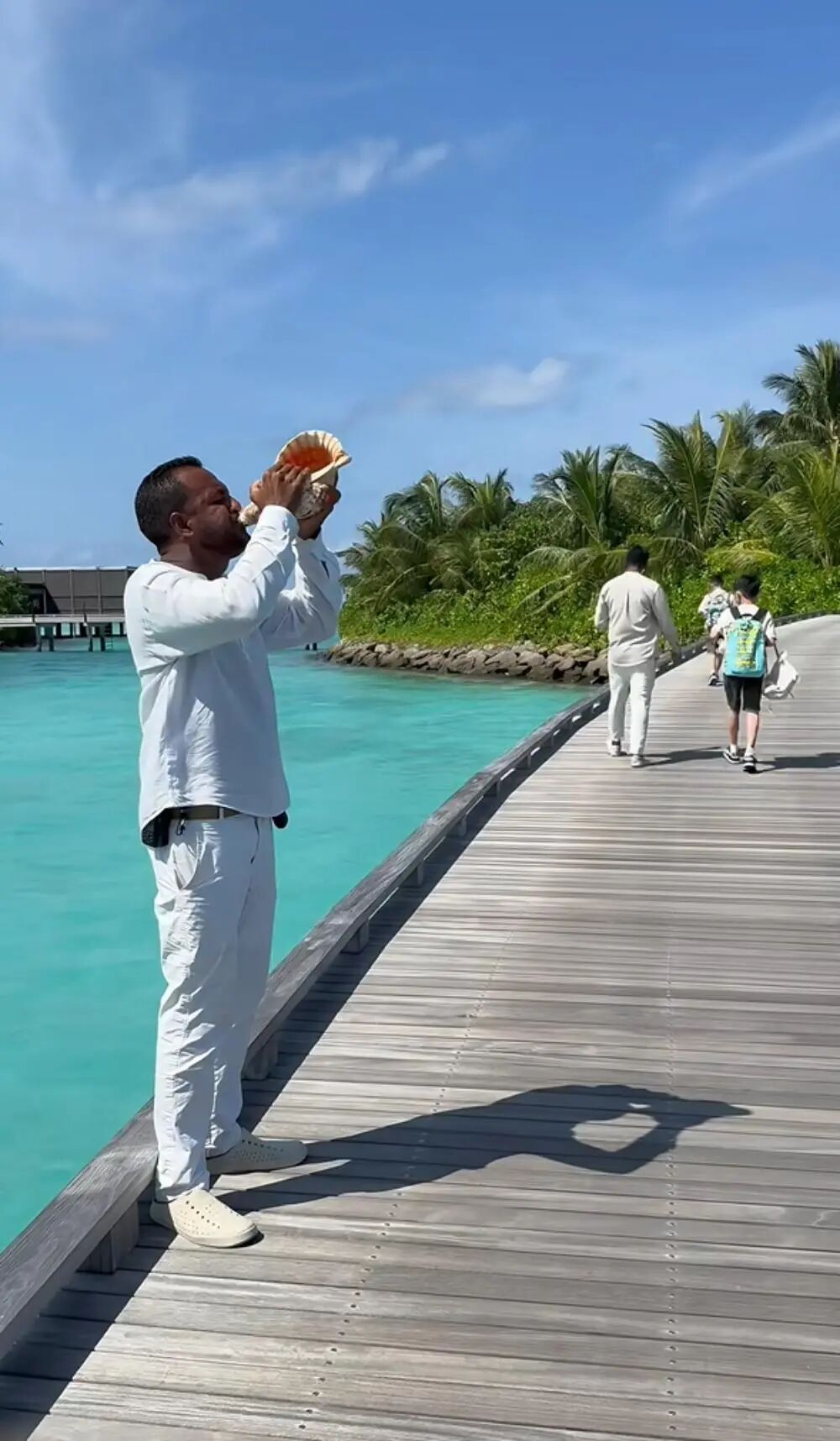 经过一段悠闲的航行 游艇终于靠岸。酒店的工作人员早已在码头等候 看到他们走近立刻吹响了海螺 清脆的声音在海边回荡 像是在热情地说 “欢迎回家”。陈若仪说这是她第一次收到这样的欢迎礼 心里暖烘烘的。他们订的是一套超大的两室海景房 推开房门就能看到蓝色的大海 房间外面还有个露天泳池 池边摆着遮阳伞和躺椅 光是站在门口看一眼就觉得特别享受。