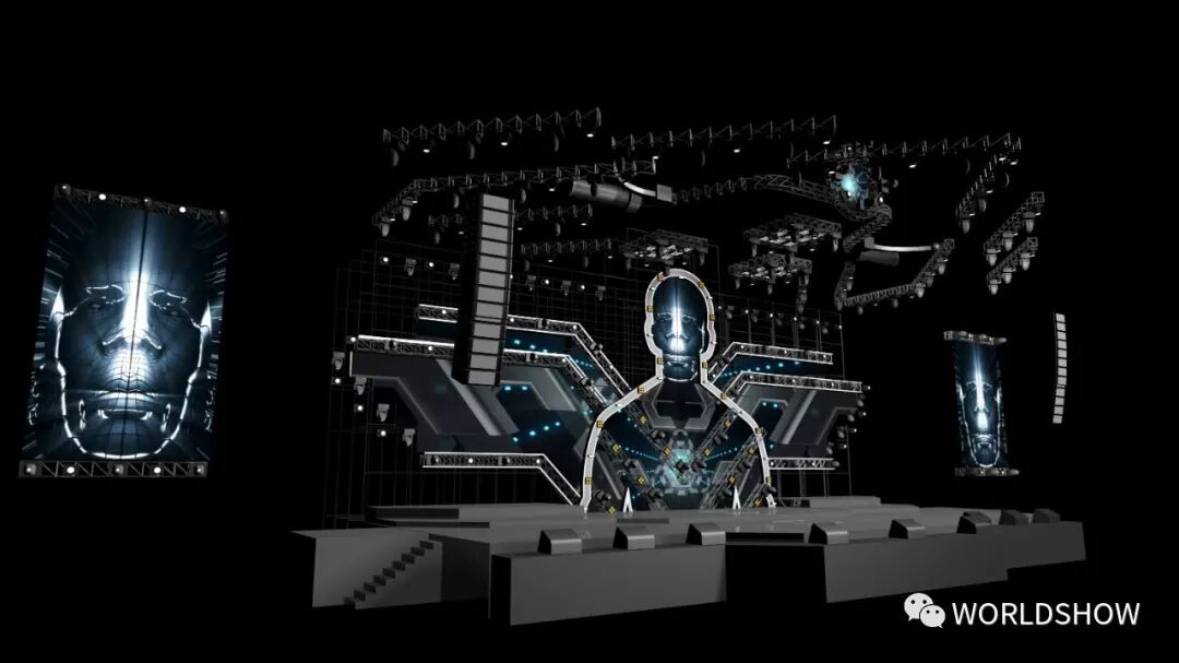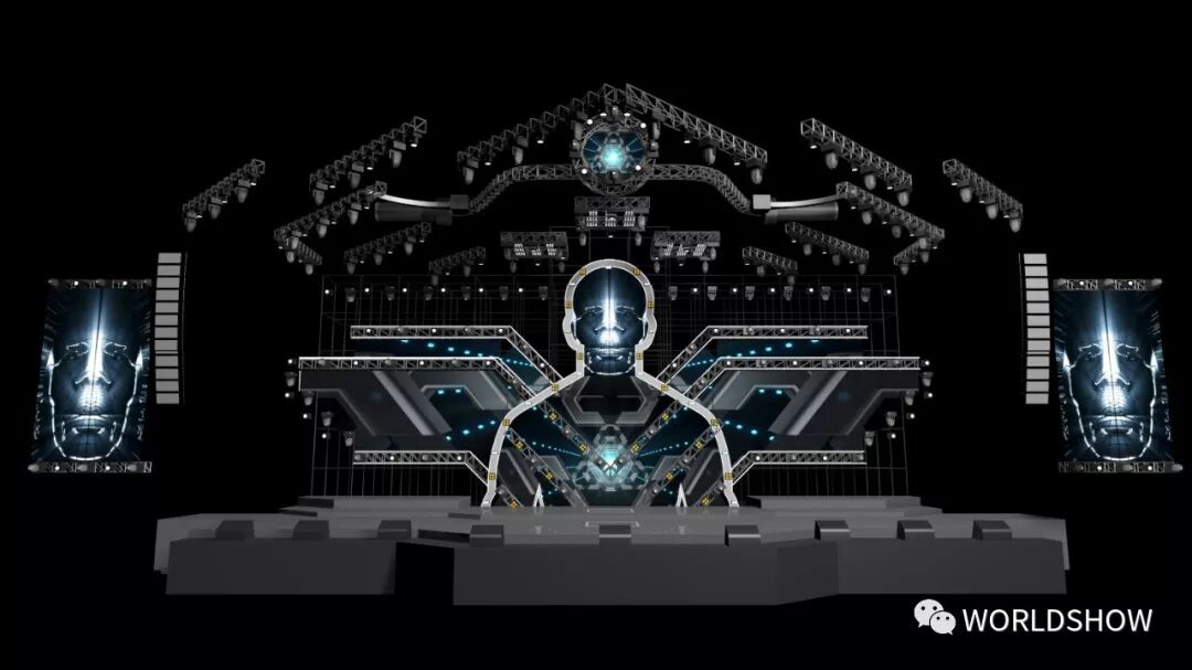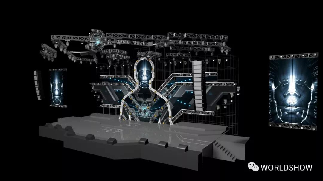 舞台中央以⼀个巨⼤有震撼⼒的神秘肖像为中⼼视觉结构形体输出,两侧展翅式往外延伸,内隐藏灯阵、⾼精度LED屏幕、数控灯带构成。其中光束,频闪,切割,效果灯,激光灯,观众灯,矩阵灯将近800台。5组数控灯架,2组机械升降,舞台⾯积512平⽶。7特效系统全部进⼊控台编程控制。主题视觉⾥⽤圆形屏和机械装置组成了⼀个巨型摩托⻋⻋头,搭配杨坤个⼈影像进⾏呈现。