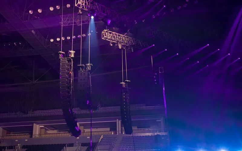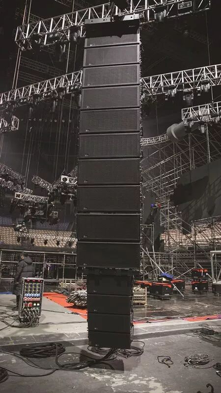 本次巡演⼤连站⾳响总监SAG创始⼈张博⽼师介绍,主扬声器阵列使⽤了Meyer Sound LEO,每组14只Leo-M+2只Lyon-W;Outside fill扬声器阵列采⽤了10只Lyon-M和4只Lyon-W,全⾯覆盖看台上的观众;Front fill扬声器使⽤了4组每组3只Leopard,来覆盖最前⾯⼏排的观众。