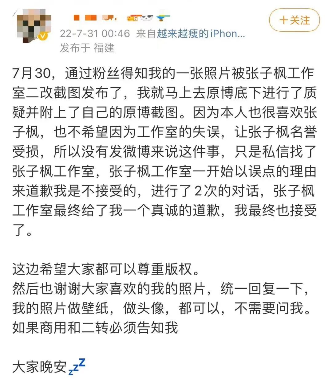 博主一开始还挺生气,但架不住张子枫粉丝去人家那进行骂战,导致博主还删掉不少言论。这下工作室都积极道歉了,原博主也是“很大方”又发博原谅了张子枫那边,至此这波盗图操作也就画下了句号。