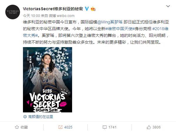 维密官博于14日宣布,奚梦瑶和何穗将成为维多利亚的秘密大中华区品牌大使。