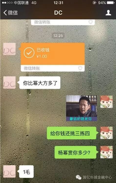 贾乃亮晒出了他和杜淳的聊天截图,在图片中,他先是祝杜淳生日快乐,杜淳则催他发红包,“来点实际的赶紧,家里缺钱”。收到指令后,贾乃亮立即发出了一块钱的红包,杜淳收下后,还称“你比幂大方多了”,原来杨幂只给了一毛。