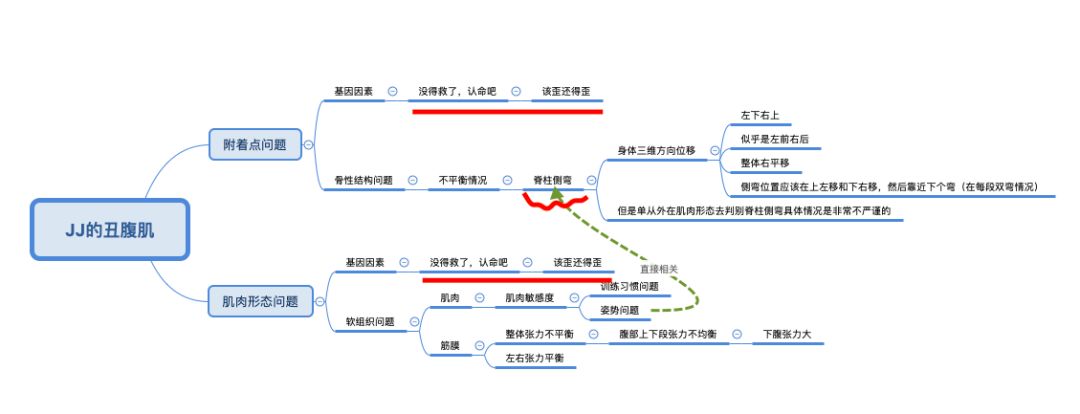 其实肌肉形态问题有很多方面,比如筋膜或者神经发力等等,但其实这个跟脊柱侧弯是一个鸡生蛋,蛋生鸡的问题。你说不清楚是先发生了肌肉本身的问题,从而导致了后面的脊柱侧弯,还是先有了脊柱侧弯的情况,后面加剧了肌肉的不平衡,亦或是两者同时在产生,并相互影响呢?
