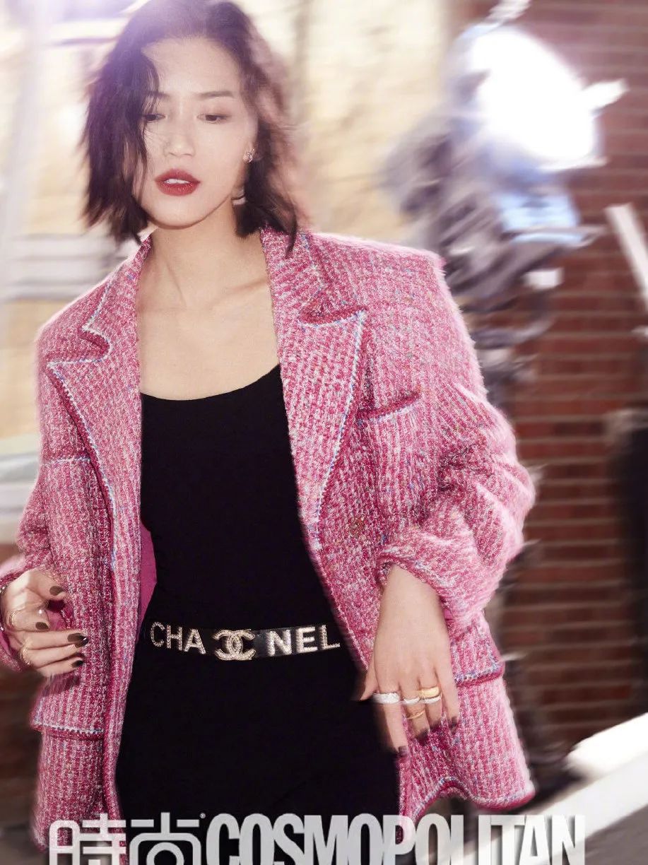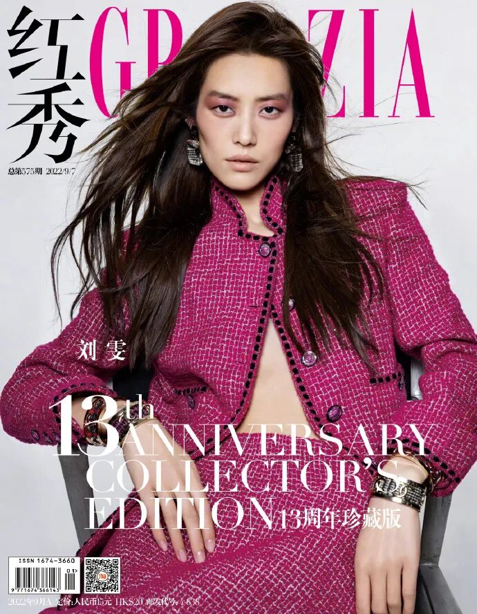 桃红斜纹软呢套装,搭配同色眼影,红秀GRAZIA 九月13周年这封面,让人疑惑是2012的大片,还是2002年发廊小妹照。