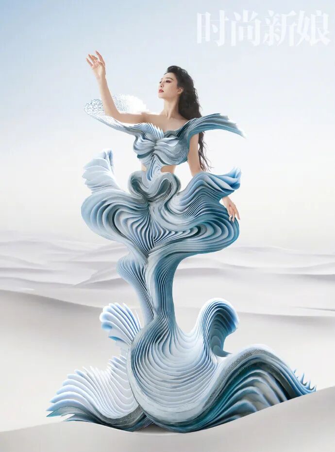 时尚新娘封面女郎,海藻般的浓密长发配白裙,也是多了些楚楚可怜的氛围效果。