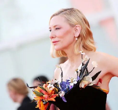 第76届威尼斯电影节,她携新片"Tar"亮相首映红毯,同样穿了Schiaparelli秋冬高定,黑色丝绒裤装配花朵装饰,霸气极了: