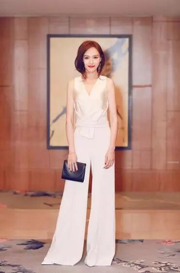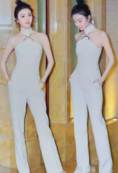 同穿白色的连体裤,景甜选择的是挂脖的款式,性感的锁骨和优美的手臂线条一览无余,减龄的丸子头,精致的妆容,简单干练,年轻靓丽!