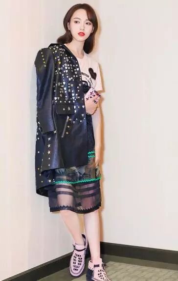 唐嫣在出席活动的时候一般穿的都比较保守一些,白底印花的甜笑+透视半身裙+黑色的铆钉皮衣+粉色的平底鞋,侧分微卷发型,一抹红唇的她,时髦帅气又不失少女的甜美!