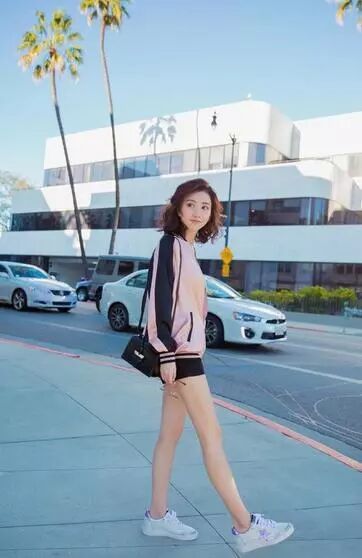 景甜则穿的比较娇俏,白色的印花T恤+黑色的短裤+拼色的外套+小白鞋,一双纤细的美腿尽显,微卷的侧分短发,很少女,也很有活力的一身穿搭!
