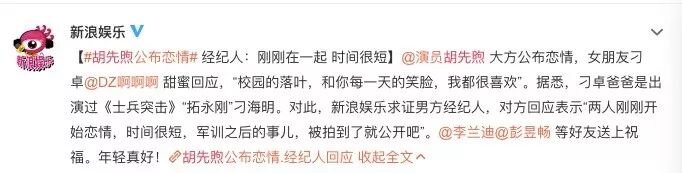 喜欢就是喜欢,像之前鹿晗在自己事业资源最好的年龄里面,宣布感情,即使伤了许多的“女友粉”,也希望能给女友一个安心;像现在胡先煦在刚满18岁,考入中戏,事业上升期宣布恋情,是对这段感情的负责,是一个男孩该有的担当。