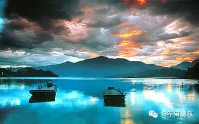 日月潭四周群山环抱,重峦迭嶂,潭水碧波晶莹,湖面辽阔,群峰倒映湖中,优美如画。