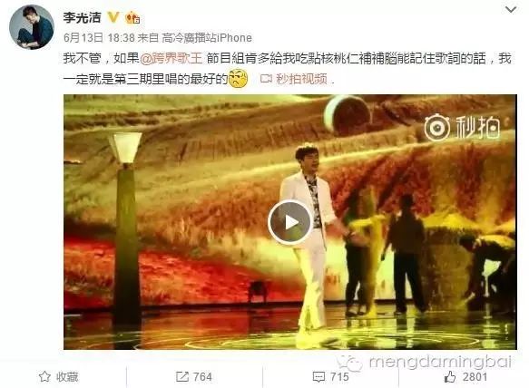 演员跨界唱歌其实是有优势的,台词功底过关,发声就没有大问题,音色好气又足唱的部分不会露怯,再加上舞台演绎能力,就会出彩。李光洁之前是卯足了劲专攻唱歌来的,昨天晚上想明白了,用音乐剧的方式唱陈小春的《情瘤感菌》,整个人状态放松,表演连贯,马上就不一样了,有点小惊艳:
