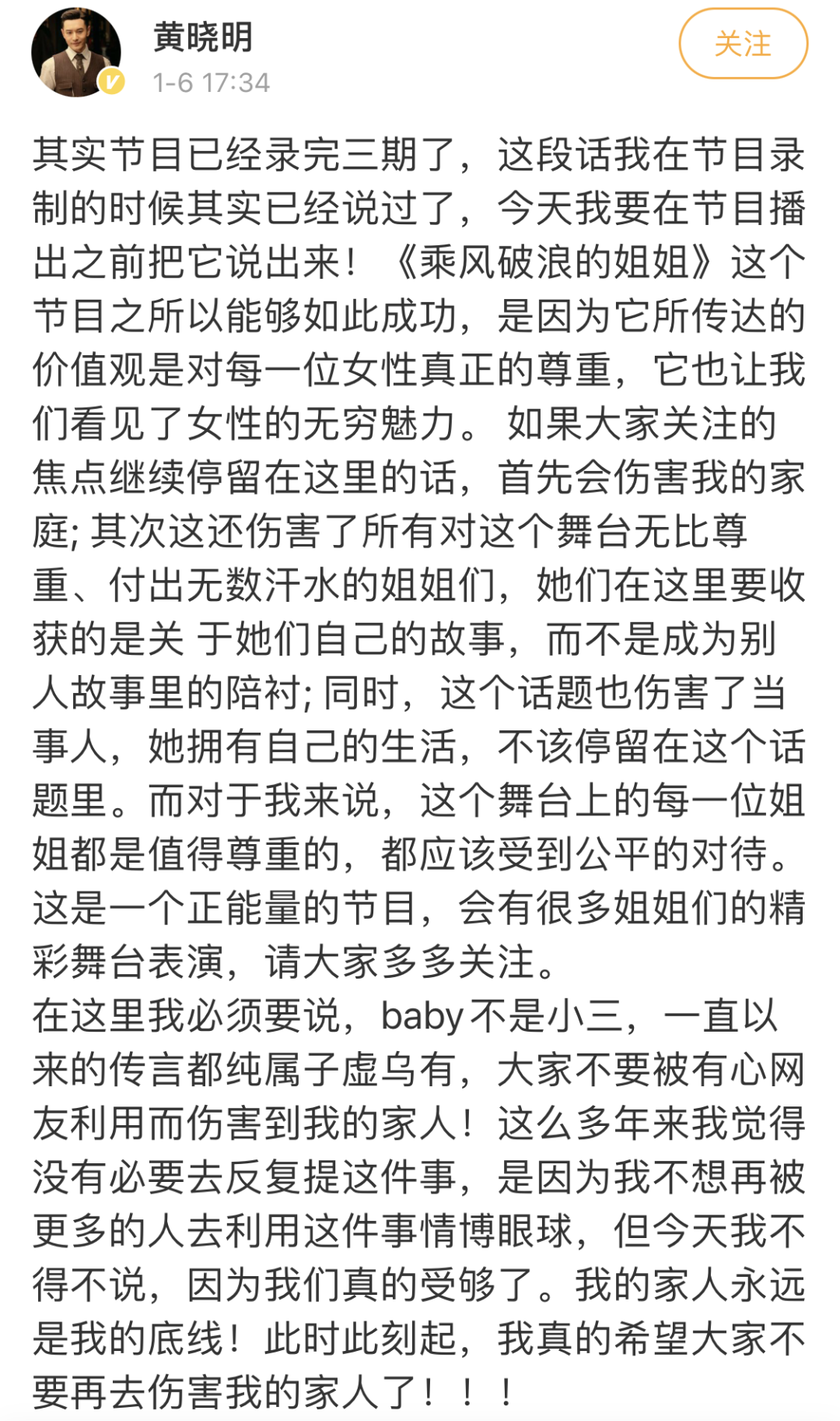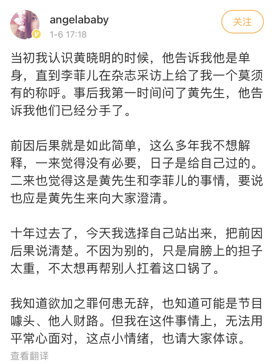 “世纪小三”打破沉默,Angelababy欲铲平黄晓明? MISS南 港台女星 2021-08-23 14:35:14 1077 创作不易,用心坚持,欢迎请BaGua喝几杯爱心咖啡!打赏并支持本文 打赏并删除本文 【上期导览】▲点击图片阅读全文经过这些年网络的“洗礼”,明星们似乎一个个都练就了一副铁石心肠,不轻易泄露任何情绪。明星的微博基本上都是稳定如山,纹丝不动,除了宣传活动,就是宣传代言。除了偶有几个人缘好的明星,还会发发绝对不得罪人,没有任何可挑剔的日常。就算是他们宣布结婚离婚的消息,也是经过深思熟虑的文字,看不出任何情绪。但今天,一段连普通网红微博上都不太会出现的充满真情实感的内容,出现在粉丝一个亿的Angelababy的微博上,顿时,新浪热搜就被这条微博以及相关内容承包了。在这条微博中,Angelababy透露出二个讯息,耐人寻味:一是直接指出李菲儿说她是第三者。微博中说而她和黄晓明认识的时候,黄晓明说自己是单身。李菲儿说她是第三者之后,她去问黄晓明,黄晓明和她说已经分手了。这段讯息说明,baby认为:黄晓明和李菲儿,必然有一个说谎了。二是对黄晓明的称呼除了“黄晓明”还有就是“黄先生”。而黄晓明在回复中,则称呼她为Baby和“家人”。尽管baby不是第一次称呼黄晓明为“黄先生”,但显然已经在字里行间对黄晓明失去了以往的甜蜜和腻歪。至于为什么baby会突然发这么一条内容,很多人猜测和网传的《浪姐2》相关信息有直接的关系。据网友爆料,在《浪姐2》的录制现场,嘉宾李菲儿,和主持人黄晓明有互动,并称呼黄晓明“晓明哥”。节目还没播出,就引发了非常巨大的舆论反响。等到播出之后,可想而知,baby的日子不好过。所以也有人说,baby先发制人,发这样一条微博,是有她的考虑的。那么,黄晓明、Angelababy、李菲儿之间的故事,在八卦界的传说中到底是怎么回事呢?事情要从2009年8月开始说起。当时,黄晓明和baby在一次朋友聚会中认识,网上说是一次K歌活动。图源微博@吃瓜群众CJ在这里,小河马想敲一个小黑板:K歌场所是一个很容易“出事”的场所,大家想象一下这个气氛,年轻的男女们在一起,老酒喝喝,情歌唱唱,头一晕,眼一花,后面的事情就不好说了。娱乐圈很多八卦传言,都是始于某次K歌。然后同年9月,黄晓明主演的《风声》在中国台湾首映,baby也去捧场了,当时黄晓明对baby就很友好,还给她介绍演艺关系。到了2009年年底,两人公开互赞,黄晓明说baby可爱,漂亮,所有男士都钟意。Baby则说黄晓明很靓仔,很多女生都喜欢。2010年的时候,黄晓明和baby已经被多次拍到庆生、出游、探班、牵手等等亲密活动。这个时间线,在现在再去看,就很有意思了。因为黄晓明和李菲儿是在2008年版的《鹿鼎记》这个电视剧里相识的,当时黄晓明演韦小宝,李菲儿演韦小宝其中的一个老婆曾柔。图源微博@吃瓜群众CJ按传言两人恋爱三年分手,就算加上拍摄的时间,怎么也都到了2010年,这和黄晓明baby感情萌芽期是有重叠的。网上说李菲儿和黄晓明恋爱之后的三年里,就没有工作了,直到两人分手。到了2011年,李菲儿出现在一些港媒的杂志中,而在这些文章的中就出现了文章开头说baby说的“李菲儿说我是第三者”之类的说法。图源微博@吃瓜群众CJ按照baby的说法,她在2009年8月认识黄晓明的时候,黄晓明就说他是单身。当然,也可能是两人在2010年,开始暧昧发展的时候,黄晓明表示他单身的。而李菲儿到了2011年,开始出现在港媒杂志上,两次提到baby是第三者的事情:第一次是在对杂志的访问中,说到那个著名的“短信”:据说,李菲儿看到黄晓明手机里有一个短信,内容是:“你到底什么时候给我答复?我要的是一个男朋友,不是sex partner(性伴侣)!”图片来自港媒模拟图还有一次是李菲儿去香港,有记者问她:“你是不是黄晓明跟Angelababy之间的那个第三者?”李菲儿严肃地回应:“Angelababy才是第三者!”那么以上港媒杂志的内容,是李菲儿真的有这么说,还是港媒的杜撰呢?在baby微博发出去后不久,有微博大V表示:这些访问是港媒造谣,李菲儿告赢过港媒。所以,李菲儿到底有没有说过baby是第三者?这个可能需要接下来更多的证据。现在很明显,黄晓明和baby把皮球踢给了李菲儿。如果李菲儿真的告赢过港媒,那么把判决书拿出来晒一晒也就真相大白了。如果没有,那么2010年期间,黄晓明到底都做了什么,还是一个谜团。图源微博@吃瓜群众CJ当然,根据大家对八卦的了解,特别是网上对一些天蝎座男明星的分析,不难想象,在这个阶段的黄晓明都在做什么。话说,这也不是天蝎座男人的专利。传说中的“劈腿”,不就是这么一个操作模式吗?大家都知道,不是谈恋爱不能分手,而是正常的谈恋爱,应该是分手之后,再去发展下一任。可是现实生活中,这么守规矩的人,实在是太少了。很多人的感情,都是和A在一起的时候,好好的,突然认识了B,觉得B也不错。然后开始一段拉扯,暧昧,摇摆不定的时期。这个时候,有些A发现了,也就果断分手了。有些A则不愿意分手,继续拉扯。有些B是被骗的,他(她)一开始并不知道A的存在。在知道之后,有些B果断放弃了,而有些B则选择等待PK。而还有一部分B则是一开始就知道A的存在,但也不想放弃这段感情,所以坚定地加入抢夺战。明星的生活,其实和普通人也是差不多,并不会因为是明星,就少了那些痴男怨女的情节。总之,后来的事情大家都知道了。黄晓明和李菲儿分了手,