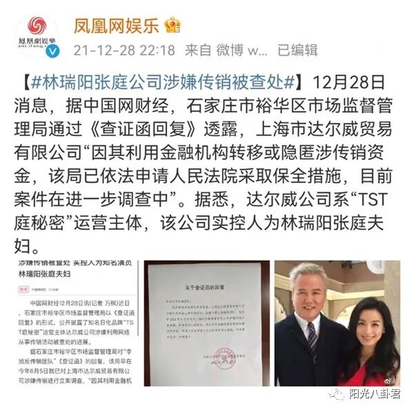 据媒体报道,张庭与林瑞阳夫妇公司因涉嫌传销被查处,