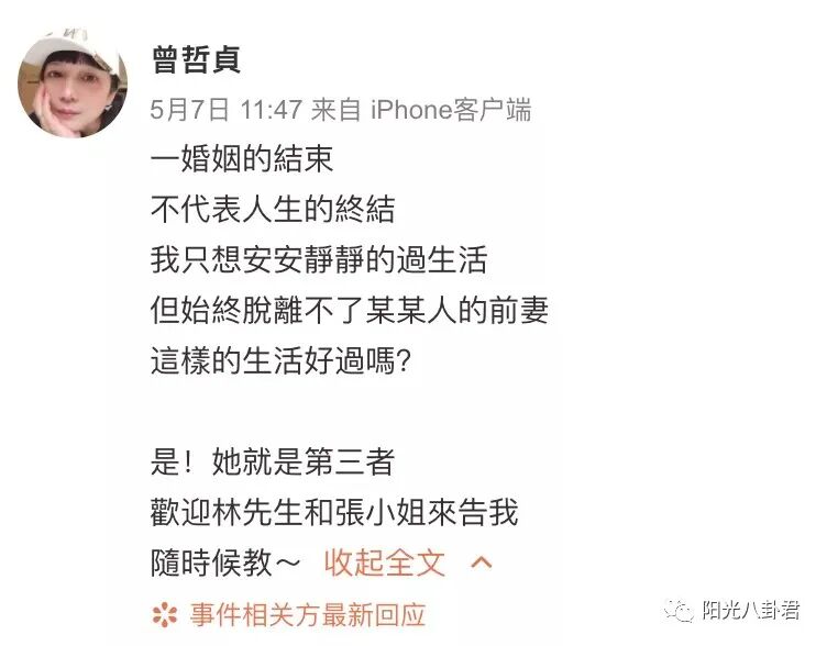 随后,曾哲贞主动发文回击。